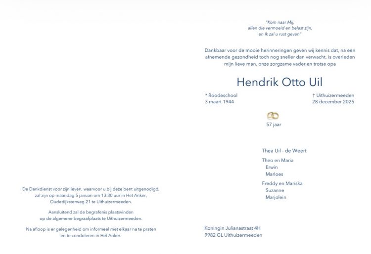 Op verzoek van de familie plaatsen wij hieronder de rouwkaart. Iedereen die de dankdienst wil bijwonen, vindt op de rouwkaart de verdere informatie.